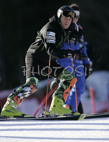 : Kalle Palander of Finland inspecting course of first run of Men Alpine skiing slalom FIS World Cup in Kranjska Gora, Slovenia. Men slalom FIS Alpine skiing World Cup was held on 4th of March 2007 in Kranjska Gora, Slovenia.