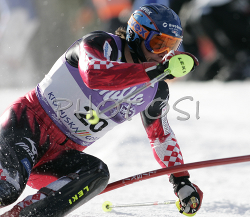 : Ivica Kostelic of Croatia skiing in first run of Men Alpine skiing slalom FIS World Cup in Kranjska Gora, Slovenia. Men slalom FIS Alpine skiing World Cup was held on 4th of March 2007 in Kranjska Gora, Slovenia.