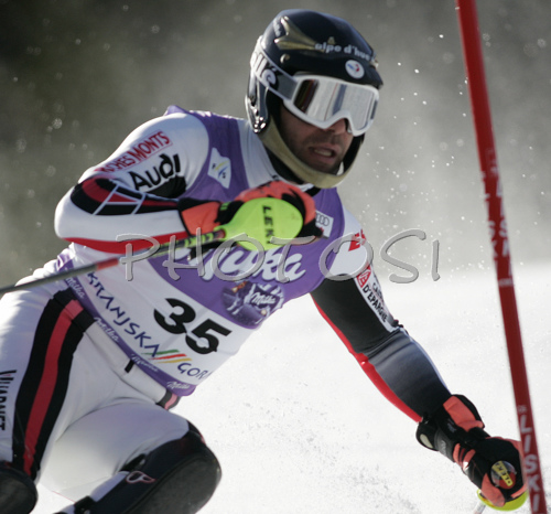 : Gaetan Llorach of France skiing in first run of Men Alpine skiing slalom FIS World Cup in Kranjska Gora, Slovenia. Men slalom FIS Alpine skiing World Cup was held on 4th of March 2007 in Kranjska Gora, Slovenia.