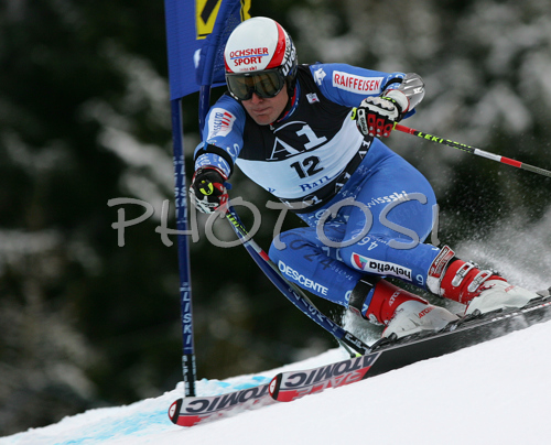 : 5th placed Daniel Albrecht of Switzerland skiing in second run of men giant slalom race of Audi FIS Men Alpine skiing World Cup 2008. Giant slalom race was held in Bad Kleinkirchheim, Austria on 8th of December 2007.