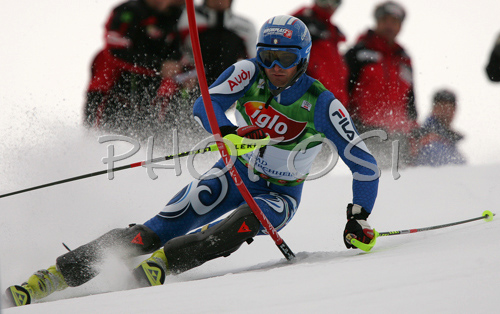 : Fifth placed Manfred Moelgg of Italy skiing in first run of men slalom race of Audi FIS Men Alpine skiing World Cup 2008. Slalom race was held in Bad Kleinkirchheim, Austria on 9th of December 2007.