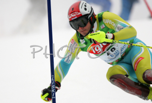 : Mitja Dragsic of Slovenia skiing in first run of men slalom race of Audi FIS Men Alpine skiing World Cup 2008. Slalom race was held in Bad Kleinkirchheim, Austria on 9th of December 2007.
