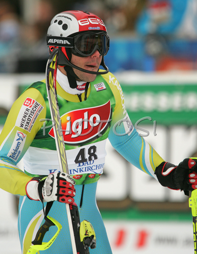 : Mitja Dragsic of Slovenia happy with his performance after second run of men slalom race of Audi FIS Men Alpine skiing World Cup 2008. Slalom race was held in Bad Kleinkirchheim, Austria on 9th of December 2007.