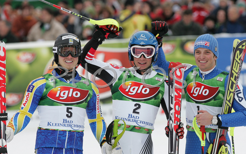: Winner Benjamin Raich of Austria (M), second placed Jens Byggmark of Sweden (L) and third placed Manfred Moelgg of Italy (R) celebrating their success in finish area of second run of men slalom race of Audi FIS Men Alpine skiing World Cup 2008. Slalom race was held in Bad Kleinkirchheim, Austria on 9th of December 2007.