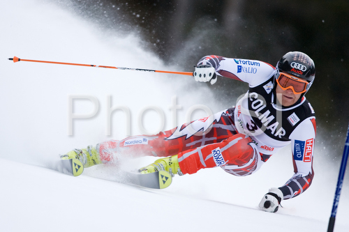 : Kalle Palander of Finland clears a gate in the first leg of the mens ski world cup Giant Slalom race in Alta Badia, Italy. Giant slalom World cup race was held in Alta Badia, Italy, on 16th of December 2007.