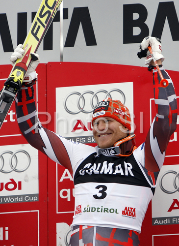 : Kalle Palander of Finland celebrates after winning ski World cup Giant Slalom race in Alta Badia, Italy. Giant slalom World cup race was held in Alta Badia, Italy, on 16th of December 2007.