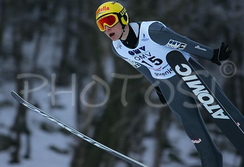 Kranj ,Slovenia - 02.02.2006 : Thomas Thurnbichler of Austria soars through the air during Individual ski jumping race of FIS Nordic Junior Ski World Championships, which was held in Kranj, Slovenia. Race was won by Gregor Schlierenzauner of Austria, Jurij Tepes of Slovenia placed second, while Andrea Morassi of Italy placed third. Photo by: Primoz Jeroncic/PhotoSI