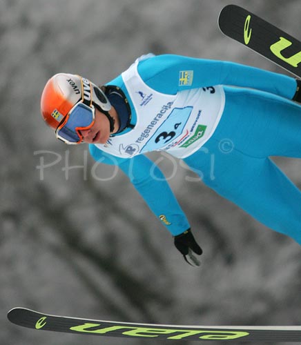: Niklas Eriksson of Sweden soars through the air during Junior ski jumping team race of FIS Nordic Junior Ski World Championships. Race was won by Austria, Slovenia placed second, while Japan finished third.