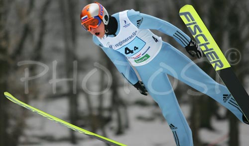 : Pavel Karelin of Russia soars through the air during Junior ski jumping team race of FIS Nordic Junior Ski World Championships. Race was won by Austria, Slovenia placed second, while Japan finished third.