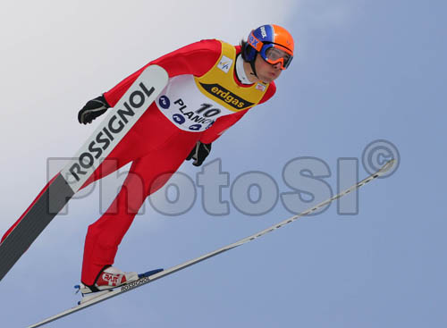 : Vincent Sevoie Descombes of France soars through the air during qualification jump for Saturdays e.on Ruhrgas FIS Ski Jumping World Cup finals. Qualifications were held in Planica, Slovenia on 17.March 2006. 15 best placed ski jumpers in World Cup are automaticaly qualified for competition while next 25 ski jumpers needs to qualify for main competition through qualification jump.