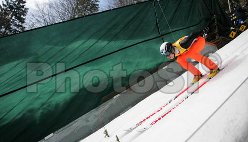 : Ski jumper on inrun of ski flying hill in Planica, Slovenia during qualification jump for Saturdays e.on Ruhrgas FIS Ski Jumping World Cup finals. Qualifications were held in Planica, Slovenia on 17.March 2006. 15 best placed ski jumpers in World Cup are automaticaly qualified for competition while next 25 ski jumpers needs to qualify for main competition through qualification jump.