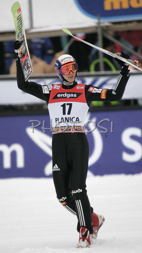 Planica ,Slovenia - 24.03.2007 : Robert Kranjec of Slovenia celebrates good jump in second round of second day of ski flying on FIS Ski jumping World Cup finals in Planica, Slovenia. FIS Ski jumping World Cup finals in Planica was held between 22nd and 25th of March 2007 in Planica, Slovenia. Second competition day of ski flying was held in Planica on 24rd of March 2007. Photo by: Primoz Jeroncic/PhotoSI