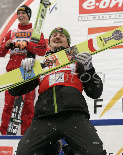 : Winner Adam Malysz of Poland celebrating his victory in last day of ski flying on FIS Ski jumping World Cup finals in Planica, Slovenia. FIS Ski jumping World Cup finals in Planica was held between 22nd and 25th of March 2007 in Planica, Slovenia. Last competition of ski flying was held in Planica on 25rd of March 2007.