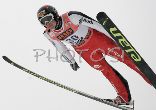 : Simon Ammann of Switzerland soars through the air in last last competition of ski flying on FIS Ski jumping World Cup finals in Planica, Slovenia. FIS Ski jumping World Cup finals in Planica was held between 22nd and 25th of March 2007 in Planica, Slovenia. Last competition of ski flying had due bad weather and hard snowfall only one serie and was held in Planica on 25rd of March 2007.