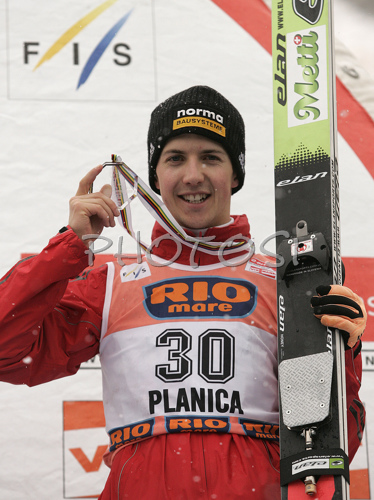 : Third placed Simon Ammann of Switzerland celebrating his overall third place after last day of ski flying on FIS Ski jumping World Cup finals in Planica, Slovenia. FIS Ski jumping World Cup finals in Planica was held between 22nd and 25th of March 2007 in Planica, Slovenia. Last competition of ski flying was held in Planica on 25rd of March 2007.
