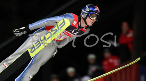 : Winner Thomas Morgenstern of Austria soars through the air during FIS Ski jumping World Cup race in Villach, Austria. First of two ski jumping World Cup races in Villach, Austria was held on 13th of December 2007, as substitute race for canceled race in Kranj, Slovenia