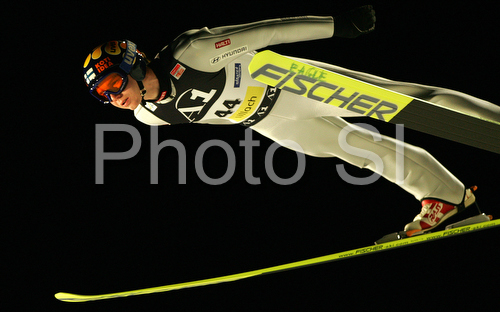 : Harri Olli of Finland soars through the air during second race of FIS Ski jumping World Cup in Villach, Austria. FIS Ski jumping World Cup race was held in Villach, Austria, on 14th of December 2007.