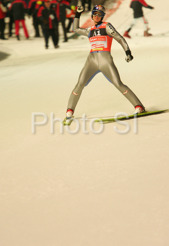 Villach ,Austria - 14.12.2007 : Winner Thomas Morgenstern of Austria celebrates his success after second jump in second race of FIS Ski jumping World Cup in Villach, Austria. FIS Ski jumping World Cup race was held in Villach, Austria, on 14th of December 2007. Photo by: Primoz Jeroncic/PhotoSI