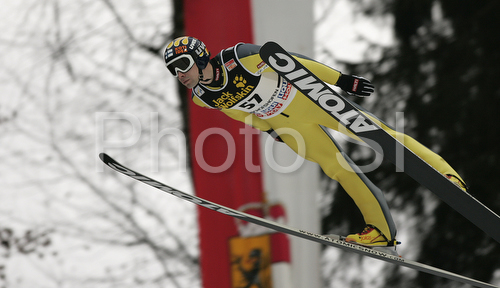 : Matti Hautamaeki of Finland soars through the air in qualifications for last race of Four Hill ski jumping tournament 2008 in Bischofshofen, Austria. Last race of 4 Hill ski jumping tournament 2008 was held in Bischofshofen, Austria on 6th of January 2008.