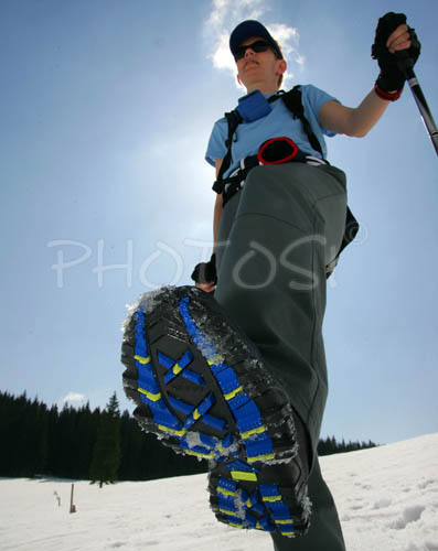 : Mountaineers are enjoying sunny and warm day in Pokljuka, Slovenia, which is still covered under more then one meter high snow cover. Sunny early spring day on Javorniska planina (meadow) in Pokljuka, Slovenia which is still under more then one meter deep snow cover, even though spring is already in valley under Pokljuka, attracted many mountaneers to go out for longer walk. Lower alttituted terrains around Julian Alps entered spring already, while terrains above 1000m over sea are still covered with snow.