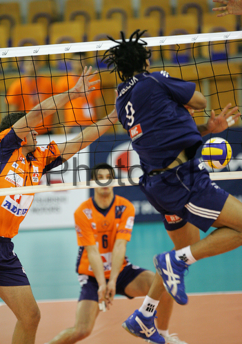: Romain Vadeleux (no.9) of Paris Volley (R) spikes when Scott Joseph Touzinsky (no.7) of ACH Volley (L) an Mitja Gasparini (no.6) of ACH Volley (M) are trying to block him during match of 3rd round of Indesit European Champions League between ACH Volley, Bled, Slovenia and Paris Volley, France. Match was played in Tivoli arena, Ljubljana, Slovenia on 12th of December 2007.
