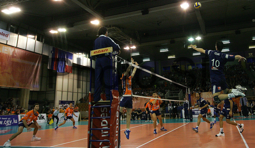 : Jiri Novak (no.10) of Paris Volley spikes over block of ACH Volley during match of 3rd round of Indesit European Champions League between ACH Volley, Bled, Slovenia and Paris Volley, France. Match was played in Tivoli arena, Ljubljana, Slovenia on 12th of December 2007.