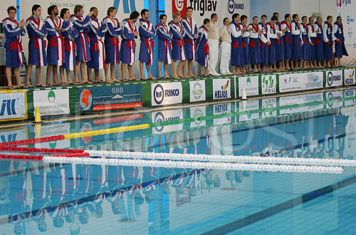 : Teams of France (L) and Slovenia (R) before first match of qualification waterpolo tournament for European championship. Match between Slovenia and France took place in Kranj, Slovenia on 7.April 2006. Slovenia defeated France with 9:7.