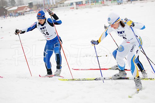 : Ulla Kiili of Finland (L) and Charlotte Kalla of Sweden (R) leading their quarterfinals group on Junior Women finals of FIS Nordic Junior Ski World Championship sprint race were held in Medvode, Slovenia. Race was won by Astrid Jacobsen of Norway, Natalia Matveeva of Russia placed second, Celine Brun-Lie of Norway placed third, while Charlotte Kalla of Sweden finished fourth.