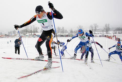 : Daniel Heun of Germany (L) infront of Martti Jylhae of Finland (M) is leading pack during Junior Men finals of FIS Nordic Junior Ski World Championship sprint race were held in Medvode, Slovenia. Race was won by Petter Northug of Norway, Daniel Heun of Germany placed second, Anton Smirnov of Russia placed third, while Anders Gloersen of Norway finished fourth.