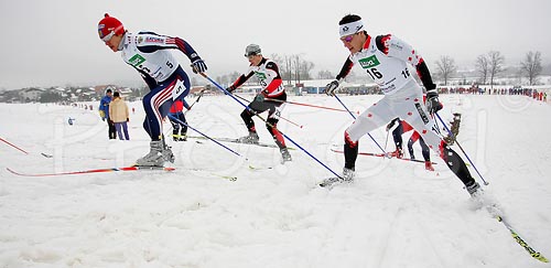 Medvode ,Slovenia - 31.01.2006 : Nikolay Morilov of Russia (L), Stefan Rosenberger of Austria (M) and Alex Harvey of Canada skiing during Junior Men finals of FIS Nordic Junior Ski World Championship sprint race were held in Medvode, Slovenia. Race was won by Petter Northug of Norway, Daniel Heun of Germany placed second, Anton Smirnov of Russia placed third, while Anders Gloersen of Norway finished fourth. Photo by: Primoz Jeroncic/PhotoSI