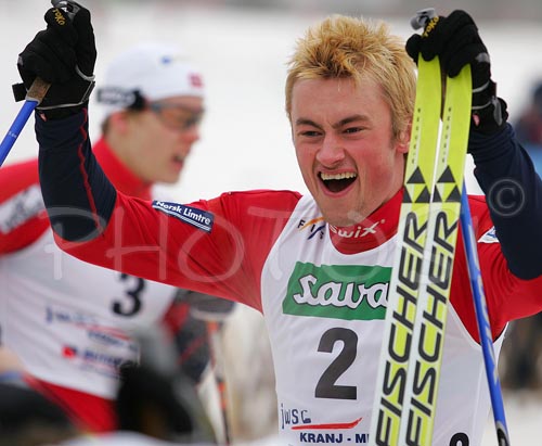 : Winner Petter Northug of Norway celebrating his victory on Junior Men finals of FIS Nordic Junior Ski World Championship sprint race were held in Medvode, Slovenia. Race was won by Petter Northug of Norway, Daniel Heun of Germany placed second, Anton Smirnov of Russia placed third, while Anders Gloersen of Norway finished fourth.