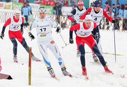 : Ingrid Vikman of Sweden (L) and Kari Vikhagen Gjeitnes of Norway leading their quarterfinals group during Under-23 Women finals of FIS Nordic Junior Ski World Championship sprint race were held in Medvode, Slovenia. Race was won by Guro Stroem Solli of Norway, Valentina Novikova of Russia placed second, Nicole Fessel of Germany placed third, while Petra Markelova of Czech finished fourth.