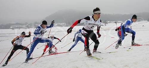 : Martin Stockinger of Austria (L) and Kalle Lassila of Finland (R) leading pack during Under-23 Men finals of FIS Nordic Junior Ski World Championship sprint race were held in Medvode, Slovenia. Race was won by Harald Wurm of Austria, Josef Wenzl of Germany placed second, Marcus Hellner of Sweden finished third, while Oeystein Pettersen of Norway finished fourth.