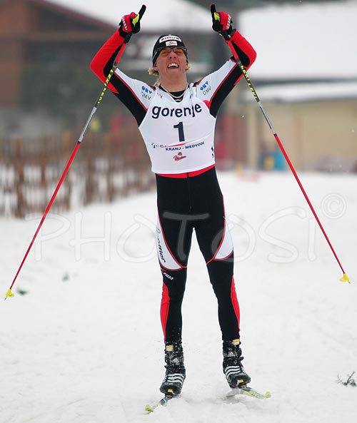 : Winner Harald Wurm of Austria celebrating his victory in Under-23 Men finals of FIS Nordic Junior Ski World Championship sprint race were held in Medvode, Slovenia. Race was won by Harald Wurm of Austria, Josef Wenzl of Germany placed second, Marcus Hellner of Sweden finished third, while Oeystein Pettersen of Norway finished fourth.
