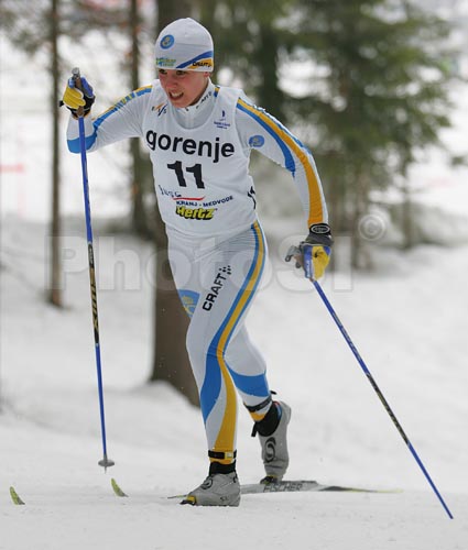 : Third placed Charlotte Kalla of Sweden skiing during Junior Women FIS Nordic Junior Ski World Championships 5km Classic race was held in Medvode, Slovenia. Race was won by Astrid Jacobsen of Norway, Eva Nyvltova of Czech placed second, while Charlotte Kalla of Sweden placed third.