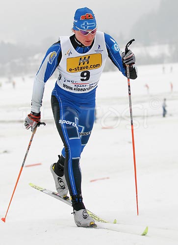: Erik Lindroos of Finland skiing during Junior Men 10km classic race of FIS Nordic Junior Ski World Championship in Medvode, Slovenia. Race was won by Petter Northug of Norway, Martin Jaks of Czech placed second, while Dario Alonzo Cologna of Switzerland finished third.