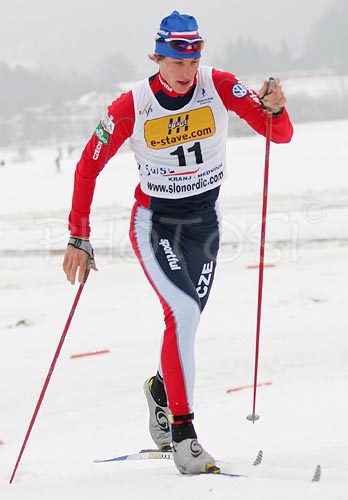 : Second placed Martin Jaks of Czech skiing during Junior Men 10km classic race of FIS Nordic Junior Ski World Championship in Medvode, Slovenia. Race was won by Petter Northug of Norway, Martin Jaks of Czech placed second, while Dario Alonzo Cologna of Switzerland finished third.