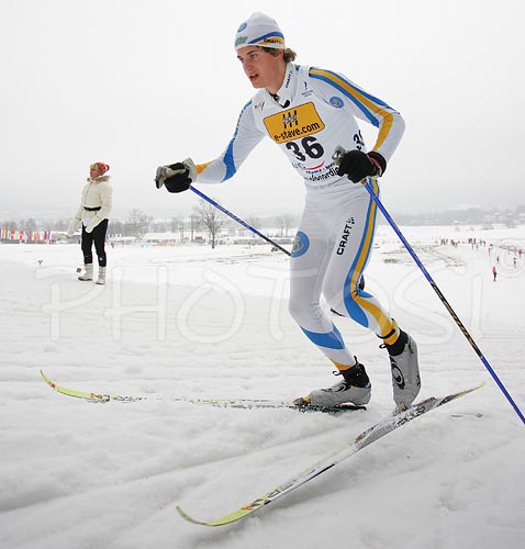 : Anton Sjoeholm of Sweden skiing during Junior Men 10km classic race of FIS Nordic Junior Ski World Championship in Medvode, Slovenia. Race was won by Petter Northug of Norway, Martin Jaks of Czech placed second, while Dario Alonzo Cologna of Switzerland finished third.