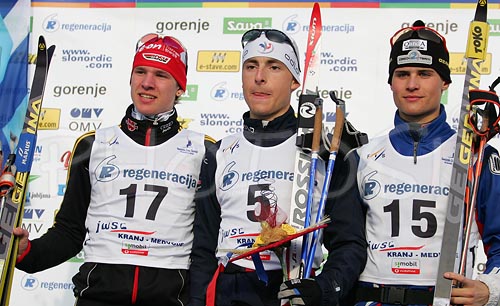 : Winner Francois Braud of France (M), second placed Tom Beetz of Germany (L) and third placed Miroslav Dvorak of Czech (R) celebrating their medals in Junior Nordic Combined 10km pursuit race of FIS Nordic Junior Ski World Championship in Medvode, Slovenia.