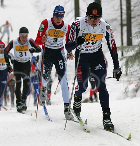 : Second placed Illia Chernousov of Russia (No.29) and third placed Martin Jaks of Czech (No.3) skiing during Junior Men FIS Nordic Junior Ski World Championships 10+10km pursuit race which was held in Medvode, Slovenia.