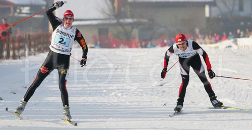 : Tom Beetz of Austria (L) celebrating victory of Germany Nordic combined team, after he outsprinted Alfred Rainer of Austria (R) in Junior Nordic Combined Ski World Championship Team race. Race was won by Germany, Austria placed second and Norway finished third.