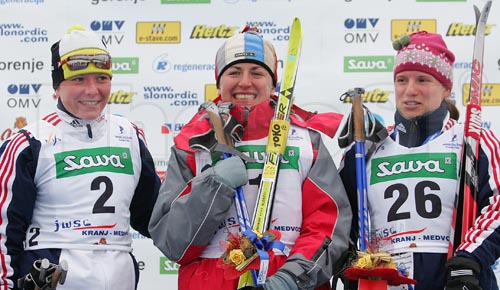 : Winner Justyna Kowalczyk of Poland (M), second placed Irina Artemova of Russia (L) and her teammate third placed Ioulia Tchekalova of Russia (R) celebrating their medals after Under-23 Women FIS Nordic Junior Ski World Championships 7.5+7.5km pursuit race which was held in Medvode, Slovenia.
