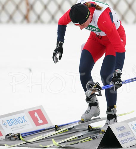 : Winner Justyna Kowalczyk of Poland changing her classic skis for skating skis during Under-23 Women FIS Nordic Junior Ski World Championships 7.5+7.5km pursuit race which was held in Medvode, Slovenia.