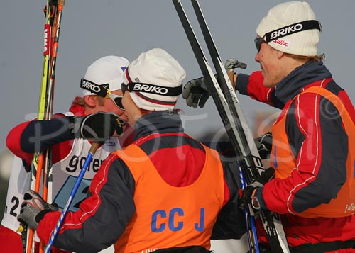 : Norwegian relay team celebrating their gold medal after Petter Northug (L) crossed finish like of Junior Men FIS Nordic Junior Ski World Championships 4x5km relay race which was held in Medvode, Slovenia. Race was won by Norway, Russia placed second, while relay of Czech finished third.