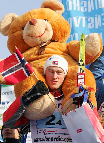 : Petter Northug of Norway with his bear celebrating his fourth gold medal in Junior Men FIS Nordic Junior Ski World Championships 4x5km relay race which was held in Medvode, Slovenia.