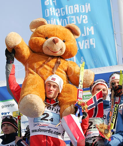 : Petter Northug of Norway with his bear celebrating his fourth gold medal in Junior Men FIS Nordic Junior Ski World Championships 4x5km relay race which was held in Medvode, Slovenia.