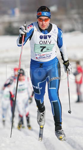 : Tiina Taskinen of Finland skiing during second lag of Junior Women FIS Nordic Junior Ski World Championships 4x3.3km relay race which was held in Medvode, Slovenia. Race was won by Norway, Sweden placed second, while Russia finished third.
