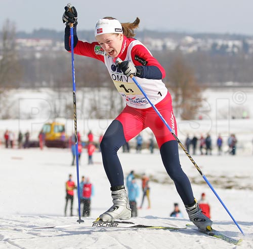 : Marte Elden of Norway skiing during third leg of Junior Women FIS Nordic Junior Ski World Championships 4x3.3km relay race which was held in Medvode, Slovenia. Race was won by Norway, Sweden placed second, while Russia finished third.
