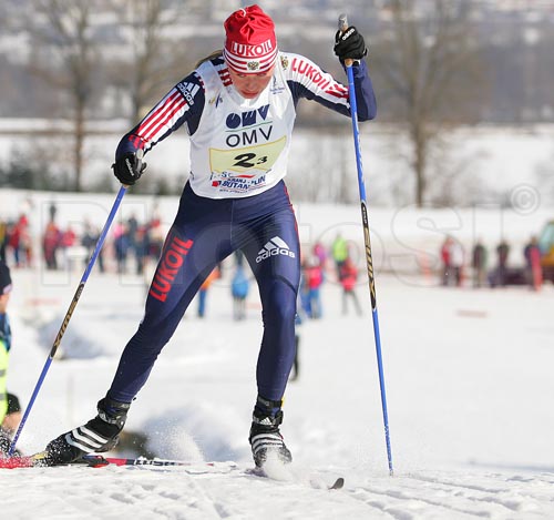 : Tatiana Morogova of Russia skiing during third leg of Junior Women FIS Nordic Junior Ski World Championships 4x3.3km relay race which was held in Medvode, Slovenia. Race was won by Norway, Sweden placed second, while Russia finished third.