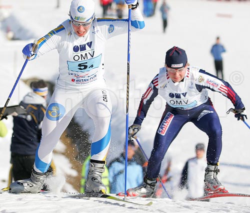 Medvode ,Slovenia - 05.02.2006 : Charlotte Kalla of Sweden overtook Svetlana Ovchinnikova of Russia in last leg of during Junior Women FIS Nordic Junior Ski World Championships 4x3.3km relay race which was held in Medvode, Slovenia. Race was won by Norway, Sweden placed second, while Russia finished third. Photo by: Primoz Jeroncic/PhotoSI